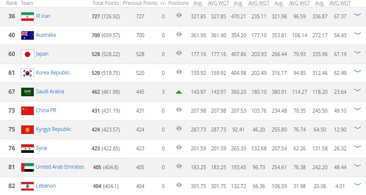 Tại khu vực châu Á, top 10 không có bất cứ sự xáo trộn nào, chỉ có Saudi Arabia tăng ba bậc nhưng điều đó cũng không ảnh hưởng gì đến top 10 châu Á so với tháng trước. Theo đó, Iran vẫn là đội xuất sắc nhất châu Á. Các đội xếp ở vị trí trí tiếp theo trong top 10 lần lượt là Úc, Nhật, Hàn Quốc, Saudi Arabia, Trung Quốc, Kyrgyzstan, Syria, UAE và Lebanon.