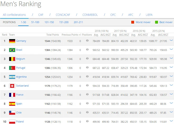 Top 10 thế giới không có bất cứ xáo trộn nào so với tháng trước, thậm chí nó kéo dài đến tận vị trí 47 mới có sự thay đổi. Đức vẫn vững vàng trên đỉnh bảng xếp hạng thế giới trước khi họ bước vào chiến dịch bảo vệ ngôi vô địch World Cup vào tháng tới tại Nga. Xếp sau Đức trong top 10 lần lượt là Brazil, Bỉ, Bồ Đào Nha, Argentina, Thụy Sĩ, Pháp, Tây Ban Nha, Chi Lê, Ba Lan.