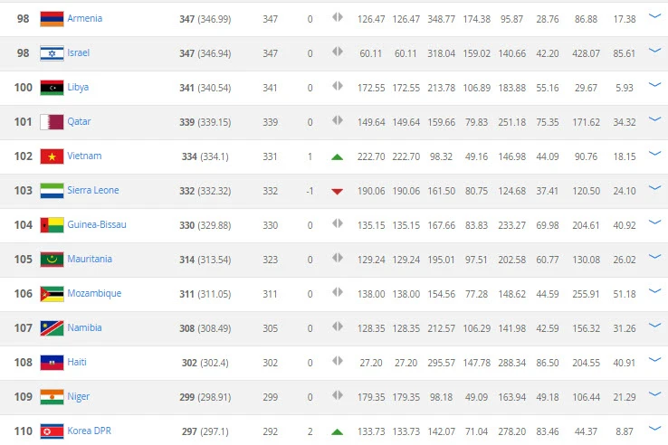 Việt Nam đứng 102 thế giới, cách vị trí thứ 100 của Lybia không xa.