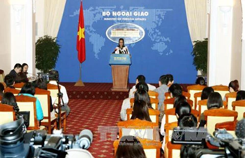 Bà Phạm Thu Hằng, phó phát ngôn viên Bộ Ngoại giao VN, phát biểu tại cuộc họp báo thường kỳ của Bộ Ngoại giao Việt Nam. Ảnh: TTXVN