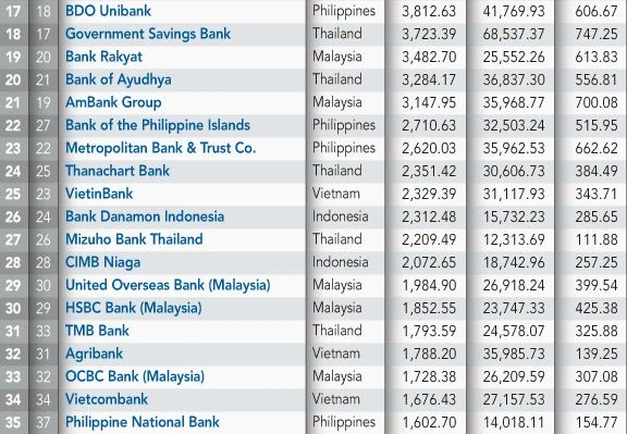 Bảng xếp hạng được chiếm lĩnh áp đảo bởi ngân hàng tại các nước như Malaysia, Singapore và Thái Lan. Cả ba nắm giữ gần ba phần tư tổng số tài sản ngân hàng của bảng xếp hạng.