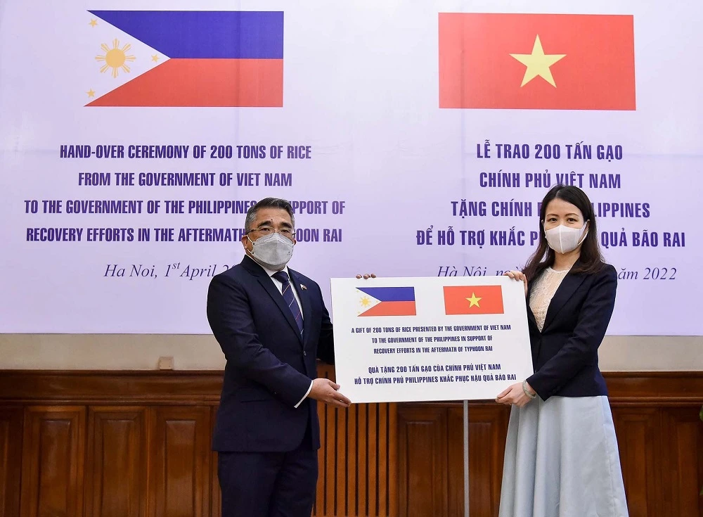 Ngày 1-4, thừa ủy quyền của Thủ tướng Chính phủ, Trợ lý Bộ trưởng Ngoại giao Nguyễn Minh Hằng đã trao tượng trưng 200 tấn gạo, trị giá gần 100.000 USD, là quà tặng của Chính phủ và Nhân dân Việt Nam gửi tặng Chính phủ và Nhân dân Philippines để hỗ trợ khắc phục hậu quả bão Rai.
