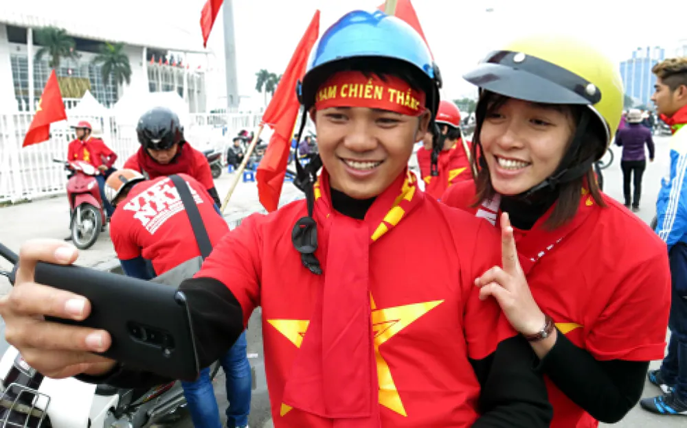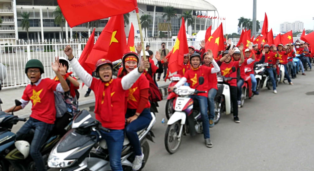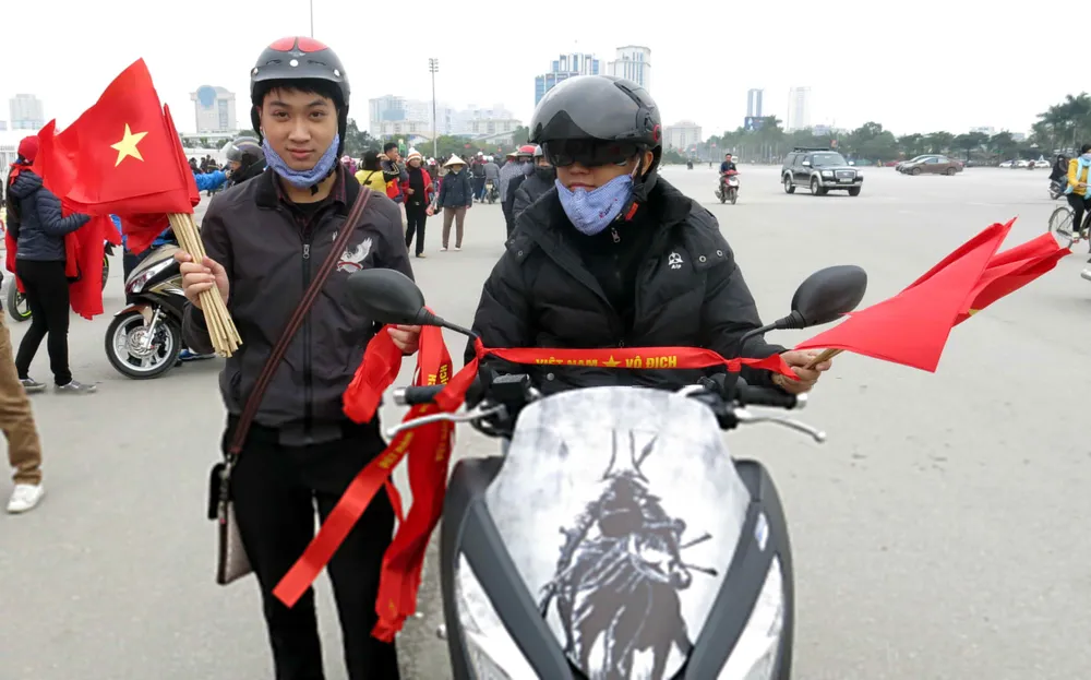 Các cổ động viên Việt Nam tận dụng mọi phương tiện tham gia đoàn diễu hành.