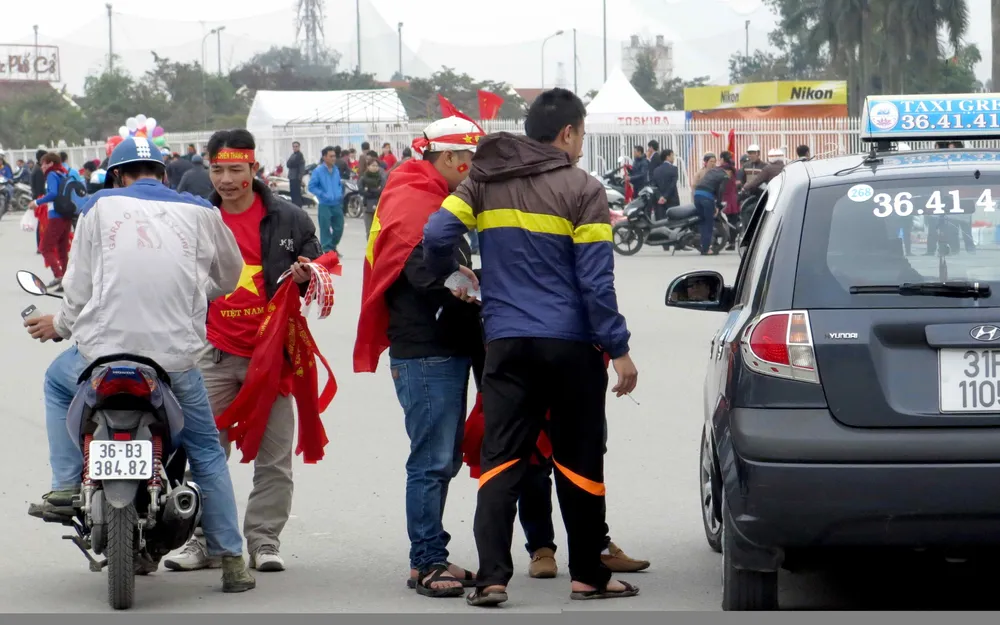 Người cần vé đến sân bằng taxi hoặc ôtô được xem là “miếng mồi ngon” của dân “phe” vé.