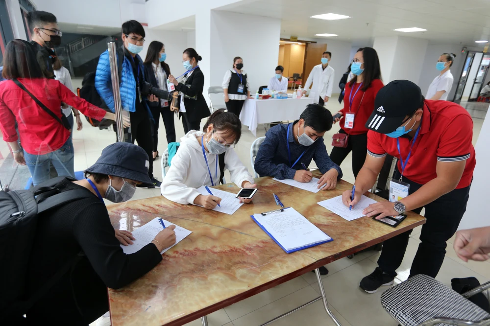 Trưởng đoàn bóng đá nữ Việt Nam - ông Phạm Thanh Hùng cũng phải khai báo y tế kỹ lưỡng.