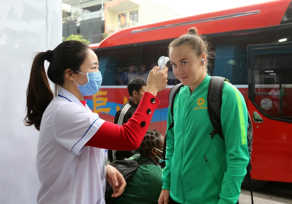 ... hay tuyển thủ Úc kiểm tra thân nhiệt.