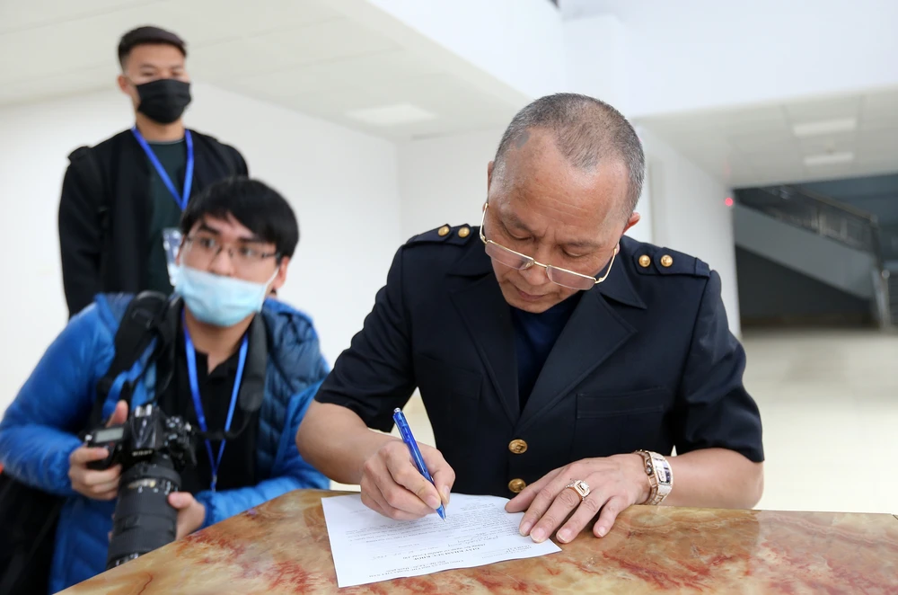 Các phóng viên thể thao đến sân Cẩm Phả tác nghiệp đều phải khai báo y tế trong mùa dịch COVID-19.