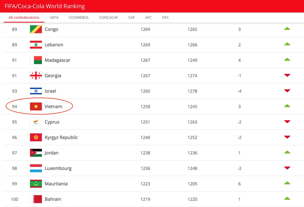 Đội tuyển Việt Nam lên hạng 94 thế giới, hơn Thái Lan 19 bậc
