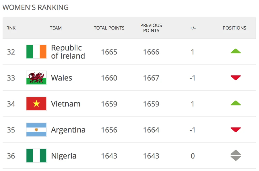 Ở bảng xếp hạng của nữ, thầy trò HLV Mai Đức Chung chính thức vượt mặt Argentina lên xếp hạng 35 thế giới, đứng thứ 6 khu vực châu Á sau các đội tuyển Úc, Triều Tiên, Nhật Bản, Trung Quốc, Hàn Quốc và xếp trên Thái Lan.