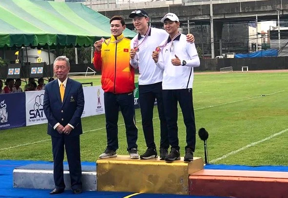 Dương Văn Đầy nhận HCB bắn cung vô địch châu Á. ẢNH: VNCC