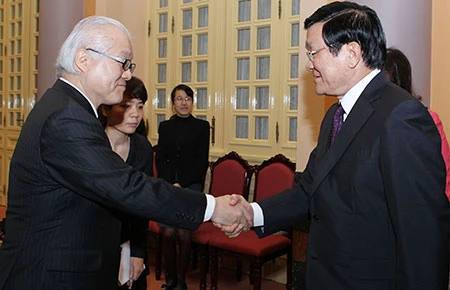 Chủ tịch nước Trương Tấn Sang tiếpThượng nghị sĩ Nhật Bản - Giáo sư Keizo Takemi đang ở thăm và làm việc tại Việt Nam. Ảnh: TTXVN
