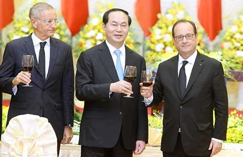 Chủ tịch nước Trần Đại Quang cùng Tổng thống Pháp Hollande tại tiệc chiêu đãi. Ảnh: TTXVN
