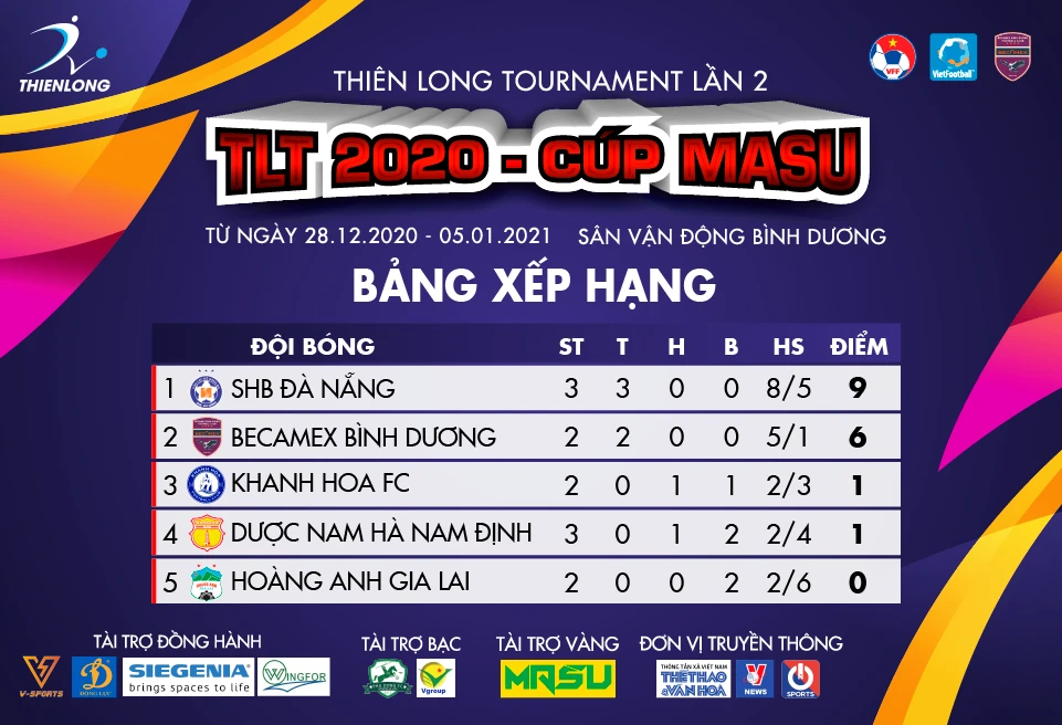 Qua ba lượt trận, SHB Đà Nẵng toàn thắng, do giải đấu có 5 đội nên mỗi lượt trận, một đội được nghỉ. B. Bình Dương mới đá 2 lượt trận nhưng cũng toàn thắng và đang ở ngôi nhì bảng.