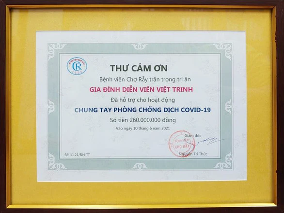 Không đứng ngoài cuộc, diễn viên Việt Trinh cũng đã cùng gia đình ủng hộ 260 triệu đồng cho đội ngũ nhân viên y tế của Bệnh viện Chợ Rẫy để chung tay phòng chống dịch bệnh nguy hiểm COVID-19.