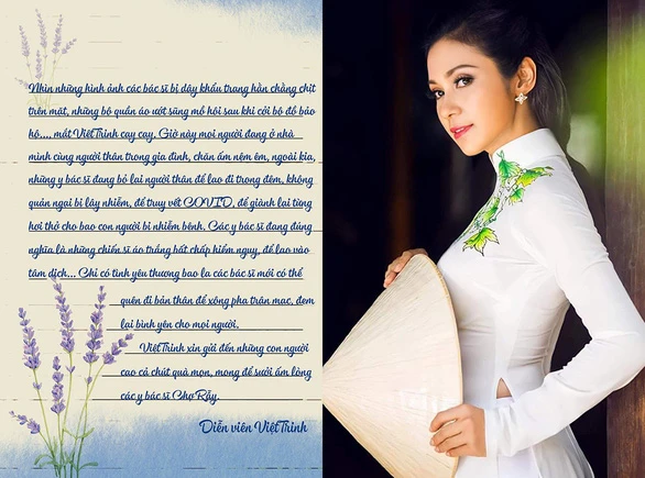 Nữ diễn viên “Người đẹp Tây Đô” chia sẻ: “Nhìn những hình ảnh các bác sĩ bị dây khẩu trang hằn chằng chịt trên mặt, những bộ quần áo ướt sũng mồ hôi sau khi cởi bộ đồ bảo hộ... mắt Việt Trinh cay cay.