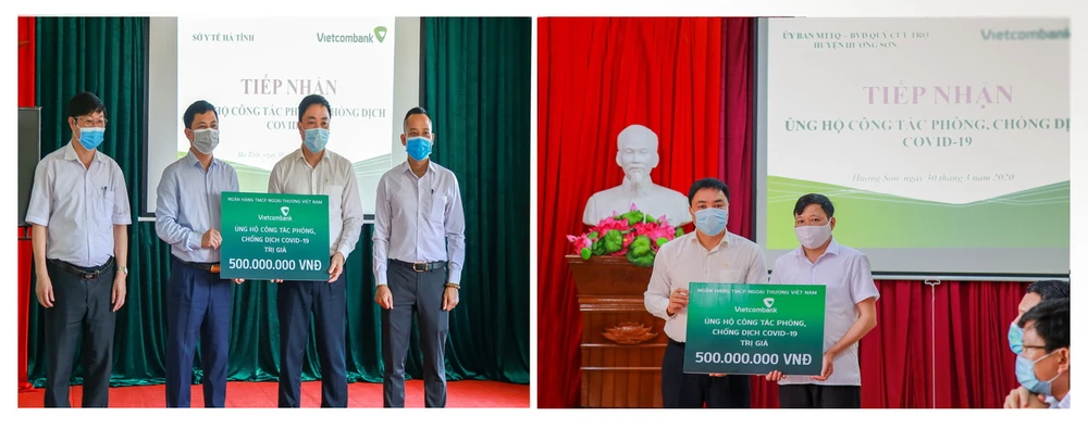 Đại diện Vietcombank ủng hộ Sở Y tế tỉnh Hà Tĩnh và huyện Hương Sơn, tỉnh Hà Tĩnh mỗi đơn vị 500 triệu đồng để mua sắm trang thiết bị y tế phòng, chống dịch COVID-19.