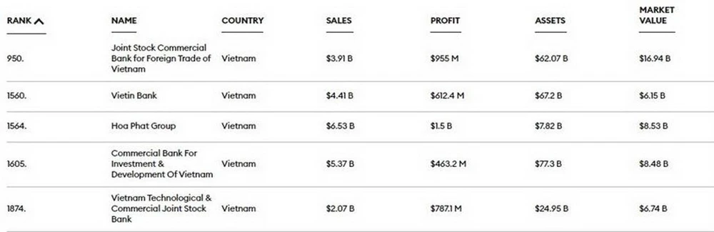 Forbes sử dụng số liệu tài chính của 12 tháng gần nhất tính đến ngày 22-4 để xếp hạng các doanh nghiệp trên toàn cầu.