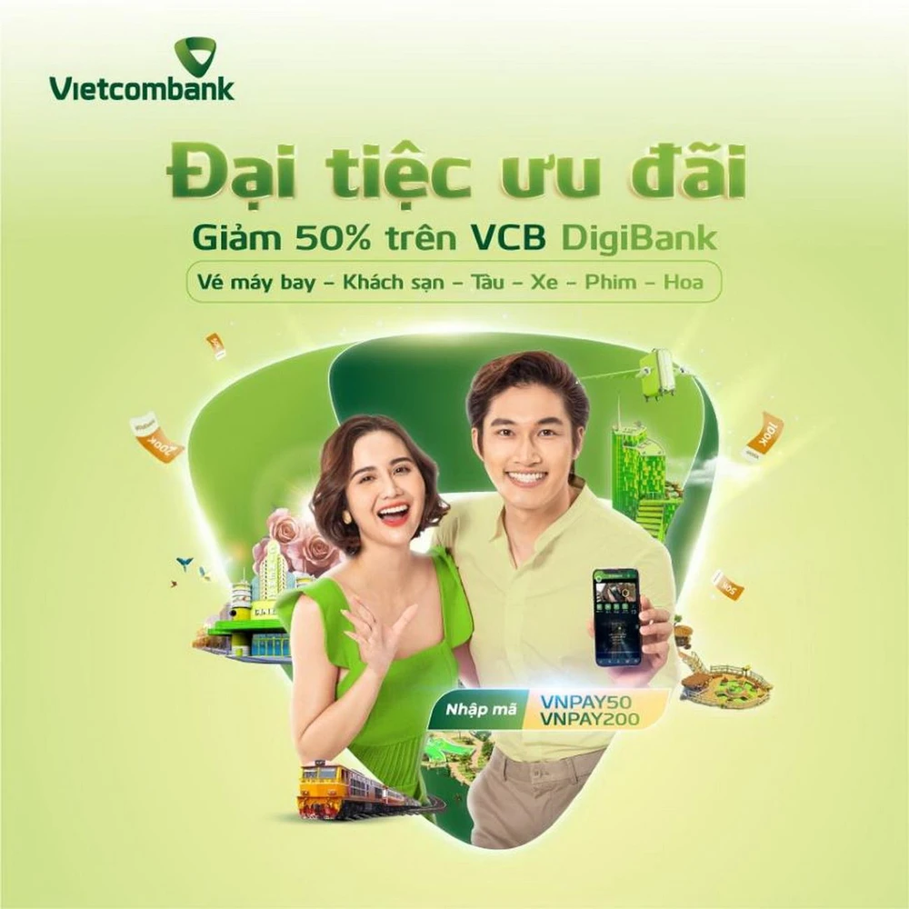 Từ nay đến ngày 07-07, Vietcombank phối hợp với VNPAY triển khai chương trình khuyến mại bùng nổ “Đại tiệc ưu đãi” dành cho các tiện ích du lịch - giải trí, trong đó giảm tới 50% khi đặt vé máy bay, khách sạn, tàu, xe, vé xem phim, đặt hoa trên ứng dụng VCB Digibank.