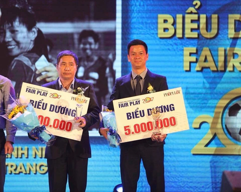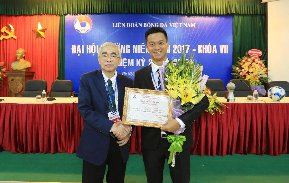 Chủ tịch VFF Lê Hùng Dũng trao bằng khen của VFF cho ông Phạm Ngọc Tuấn của Vietfootball.