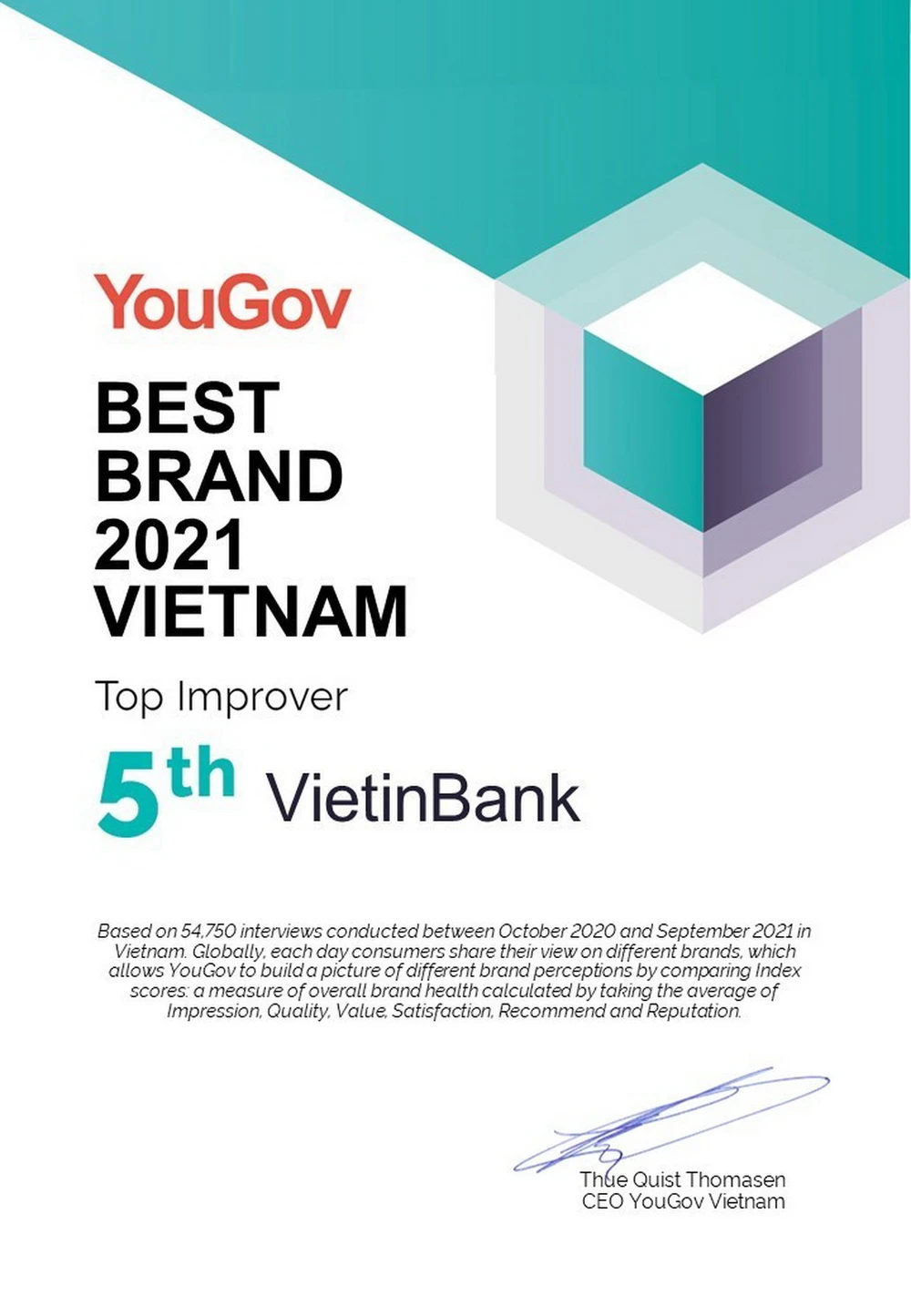 Trước đó, đầu năm 2021, theo báo cáo xếp hạng Top 500 Thương hiệu Ngân hàng giá trị nhất thế giới năm 2021 của hãng tư vấn thương hiệu Brand Finance, VietinBank tiếp tục nằm trong Top 300 Thương hiệu Ngân hàng có giá trị cao nhất. Đặc biệt, VietinBank còn xác lập cú thăng hạng ngoạn mục nhất trong số 9 ngân hàng Việt Nam trong danh sách với vị trí 216, tăng 61 bậc so với năm 2020.