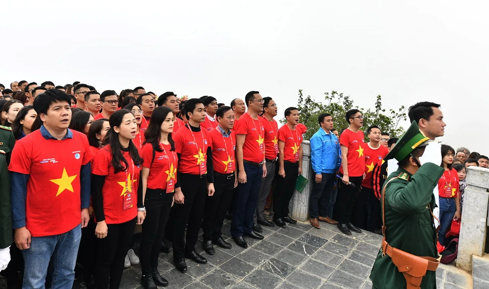 Đoàn hành trình "Tôi yêu Tổ quốc tôi" của VietJet tham gia lễ chào cờ tại cột cờ Lũng Cú (Hà Giang).