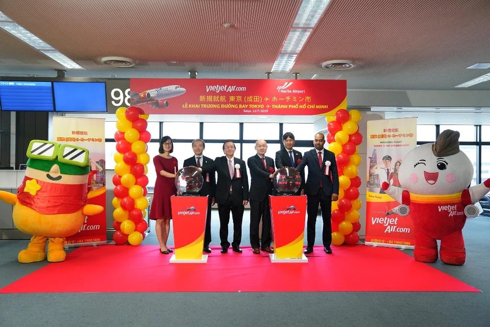 Tiếp tục mở rộng mạng bay đến Đông Bắc Á, Vietjet hôm nay khai trương đường bay TP.HCM-Tokyo (Narita). Sự kiện khai trương diễn ra tưng bừng tại sân bay Quốc tế Narita với sự tham dự của ông Kyotaro Harano, đại diện Bộ Đất đai, Hạ tầng, Giao thông và Du lịch Nhật Bản, ông Akihiko Tamura, Chủ tịch kiêm Giám đốc đại diện Sân bay Quốc tế Narita, ông Shinsuke Satake, đại diện Cơ quan xúc tiến du lịch Nhật Bản cùng lãnh đạo Vietjet và các đại lý, đối tác của hãng tại Nhật.