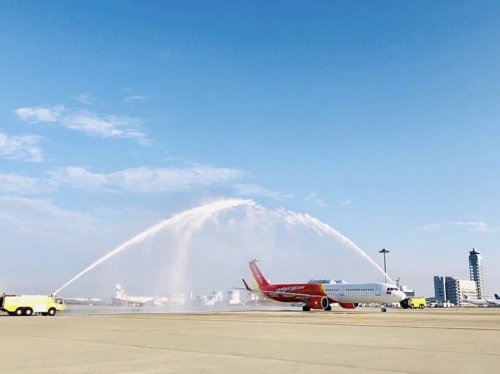 Vòi rồng chào đón tàu bay VietJet tại sân bay Kansai