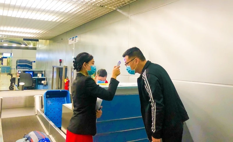 Nhân viên hãng Vietjet do nhiệt độ cho hành khách trên chuyến bay quốc tế. Ảnh: VJ