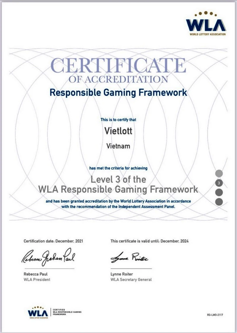 Vietlott chính thức được Hiệp hội Xổ số Thế giới công nhận đạt cấp độ 3 về chương trình Chơi có trách nhiệm trong hoạt động kinh doanh trò chơi giải trí có thưởng trên toàn thế giới.