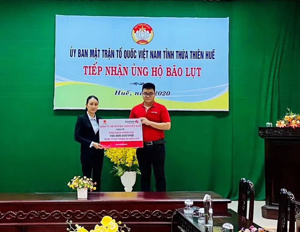 Những ngày qua mưa lớn kéo dài gây lũ lụt với những diễn biến nghiêm trọng, ảnh hưởng nặng đến các địa phương miền Trung. Với tinh thần tương thân tương ái, Công ty xổ số điện toán Việt Nam (Vietlott) đã thông qua Ủy ban mặt trận tổ quốc các tỉnh Quảng Bình, Quảng Trị, Thừa Thiên - Huế trao tặng 300 triệu đồng để giúp đỡ đồng bào miền Trung đang bị ảnh hưởng bởi bão lũ.