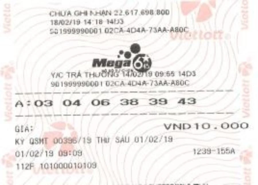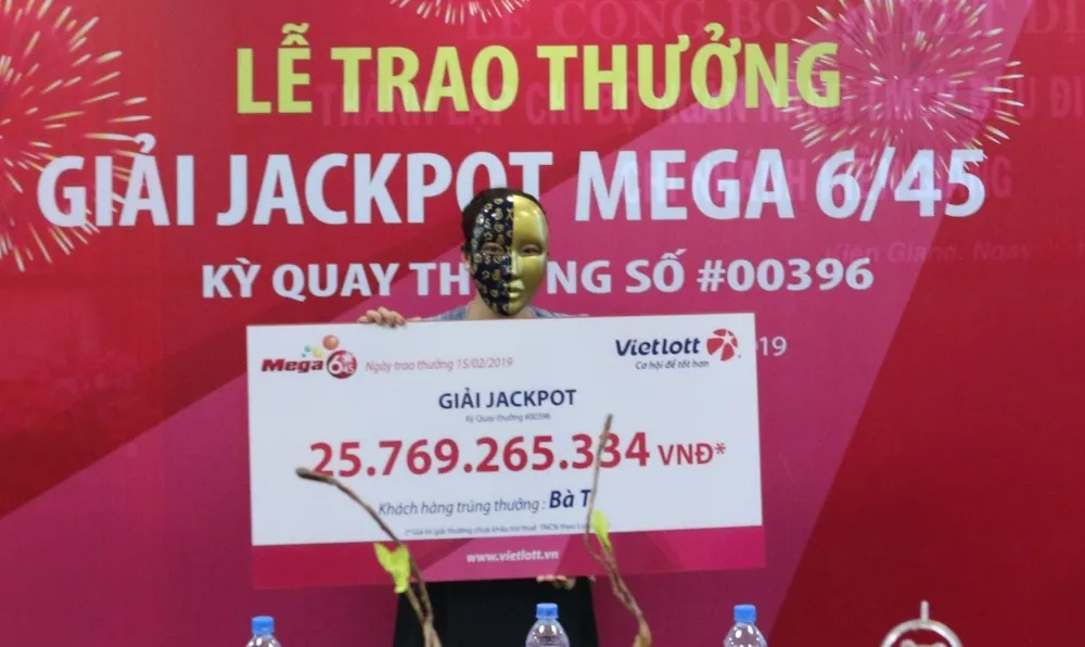 Qua kiểm tra trên hệ thống kỹ thuật và hồ sơ kèm theo, Vietlott xác định chiếc vé đã trúng giải Jackpot sản phẩm Mega 6/45 kỳ QSMT thứ 396 ngày 01/02/2019 với trị giá 25.129.665.334 đồng (chưa khấu trừ thuế thu nhập cá nhân theo quy định nhà nước).