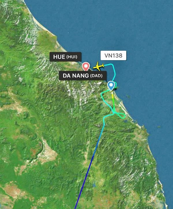 Theo dõi lộ trình khởi hành từ Flightrada24 cho thấy chuyến bay VN138 của Vietnam Airlines từ TP.HCM đi Đà Nẵng dự kiến khởi hành lúc 17 giờ 20 nhưng thực tế khởi hành lúc 18 giờ 51 phút. Cuối hành trình, máy bay đã chuyển hướng hạ cánh tại sân bay Phú Bài (Huế).