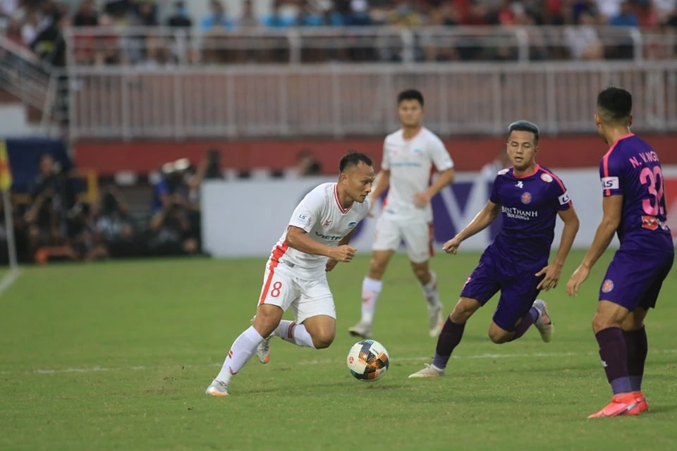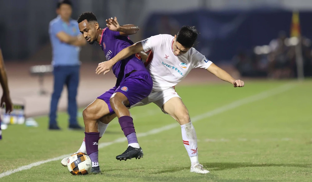 Pedro (trái) một trong hai chân sút hàng đầu của Sài Gòn hộm nay nhạt nhòa trước sự kìm cặp của hậu vệ Viettel. Ảnh: A.P