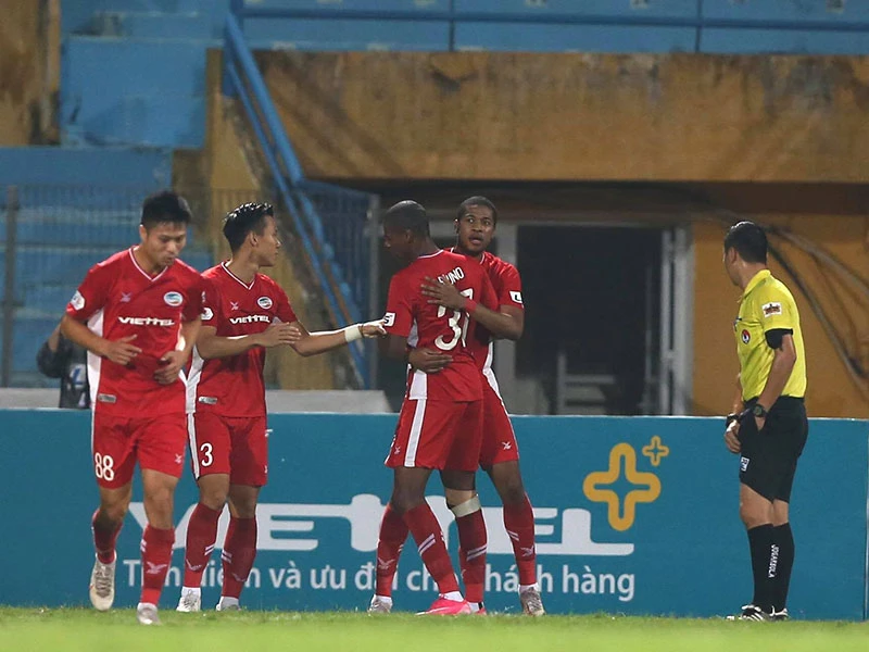 Cầu thủ Viettel ăn mừng bàn thắng của Caique. Ảnh: NGỌC DUNG