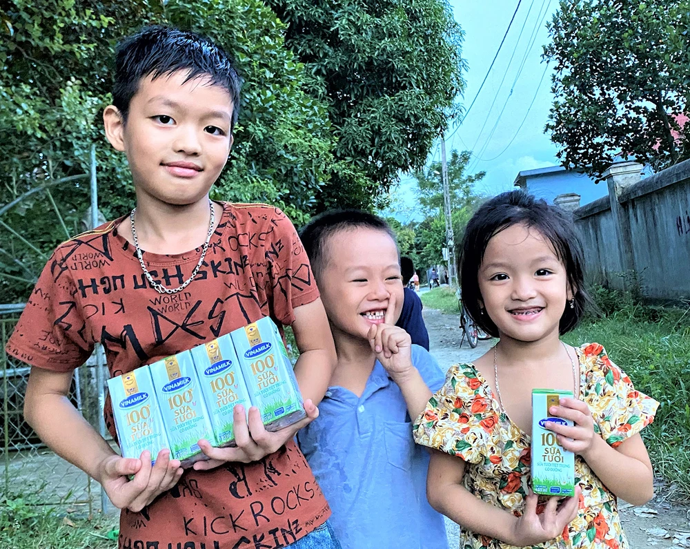 Bên cạnh học bổng, Vinamilk và Quỹ sữa Vươn cao Việt Nam còn mang đến cho gia đình Đạt và các bạn nhỏ trong xóm những sản phẩm sữa giàu dinh dưỡng của Vinamilk để phần nào giúp chị em Đạt cùng mẹ tăng cường sức khỏe và đề kháng. Những hộp sữa cũng giúp chị em Đạt lan tỏa, chia sẻ niềm vui của mình với các bạn, em nhỏ trong xóm.