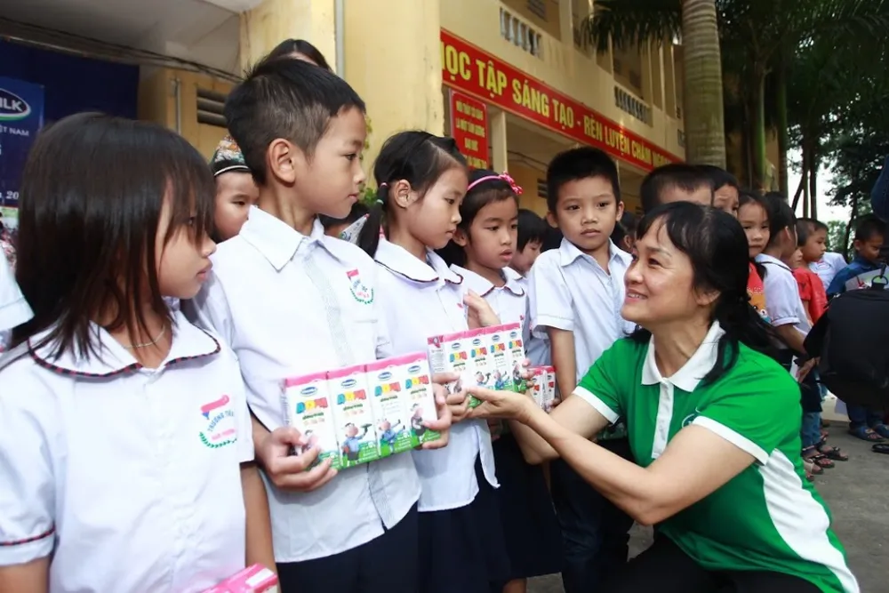 Bà Nguyễn Minh Tâm, Giám đốc Chi nhánh Vinamilk tại Hà Nội, trao quà cho các em học sinh.