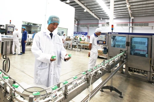 Bà Men Sam On, Phó Thủ tướng Chính phủ Campuchia và ban lãnh đạo Vinamilk cùng khách mời tham quan dây chuyền sản xuất hiện đại của Nhà máy sữa Angkor. Ảnh: ĐẶNG KIM PHƯƠNG