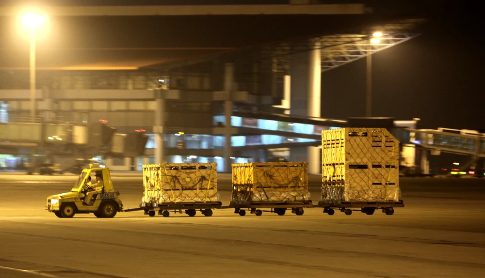 Quy trình vận chuyển bốc dỡ 400 con bò sữa tại sân bay Nội Bài diễn ra chỉ trong hơn một giờ đồng hồ. Bò được chuyên chở trong các cũi gỗ theo tiêu chuẩn và quy định quốc tế, chuyên gia Úc đi áp tải và theo dõi sức khỏe đàn bò. (Ảnh: Xuân Phú, Hữu Hải)