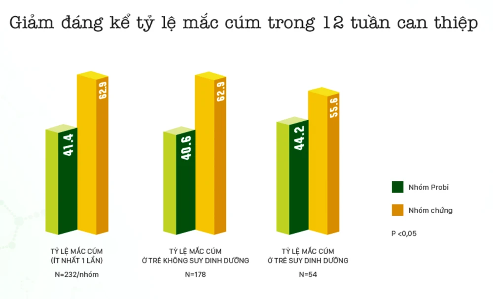 Bảng kết quả: Giảm đáng kể tỷ lệ mắc cúm trong 12 tuần can thiệp (p<0,05)