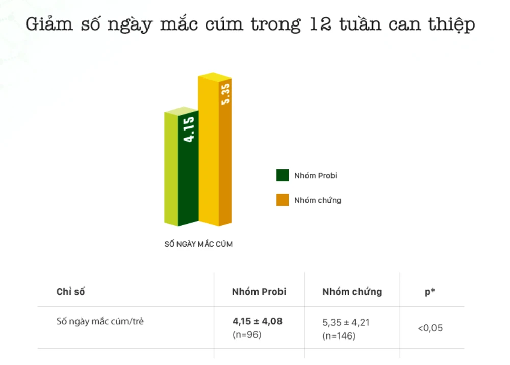 Bảng kết quả: Giảm số ngày mắc cúm trong 12 tuần can thiệp (p<0,05)