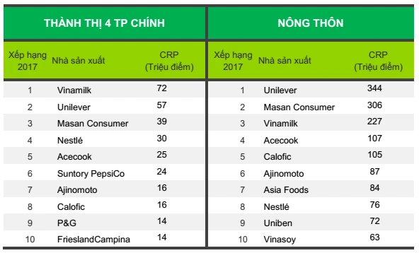 Vinamilk đứng đầu xếp hạng của 10 nhà sản xuất được chọn mua nhiều nhất ở thành thị (bốn thành phố chính) và nông thôn Việt Nam.