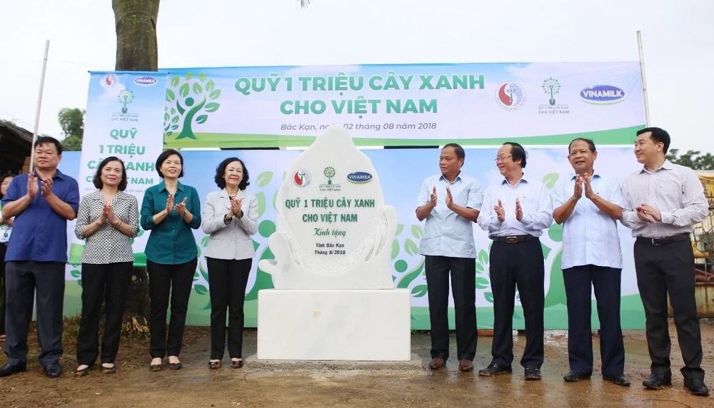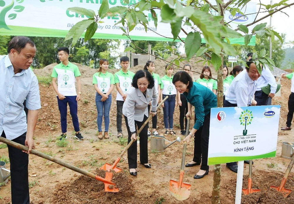 Bà Trương Thị Mai – Ủy viên Bộ Chính trị, Bí Thư Trung ương Đảng, Trưởng Ban Dân vận Trung ương và bà Bùi Thị Hương – Giám đốc Điều hành Vinamilk cùng các đại biểu trồng cây tại khu Di tích lịch sử cấp Quốc gia Nà Tu, tỉnh Bắc Kạn