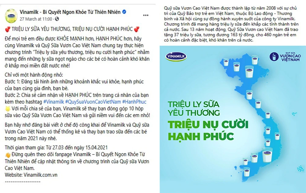 Chiến dịch diễn ra từ 27-3 đến 15-4-2021, với mỗi chia sẻ được đăng tải, bạn sẽ cùng Vinamilk gửi 10 hộp sữa đến các em nhỏ có hoàn cảnh khó khăn trên cả nước