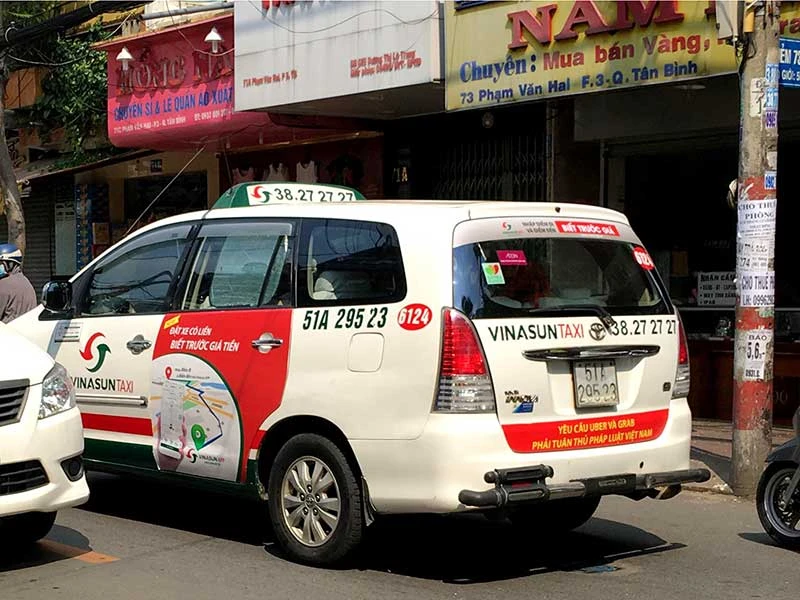 Nhiều taxi của Vinasun dán khẩu hiệu phản đối Grab, Uber. Ảnh: HỒNG TRÂM