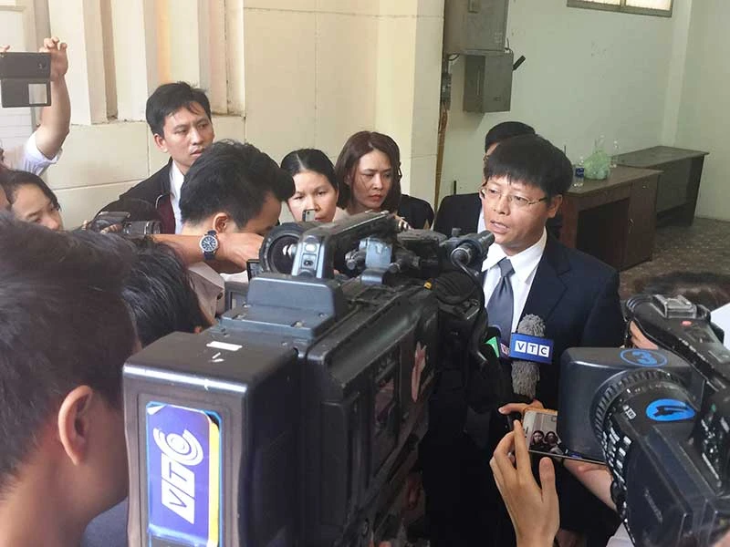 Đại diện Vinasun trao đổi với báo chí sau khi tòa tạm đình chỉ vụ án. Ảnh: HY