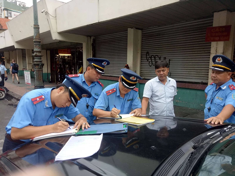 Lực lượng thanh tra giao thông xử lý tài xế dừng, đỗ sai quy định. Ảnh: N.TÂN