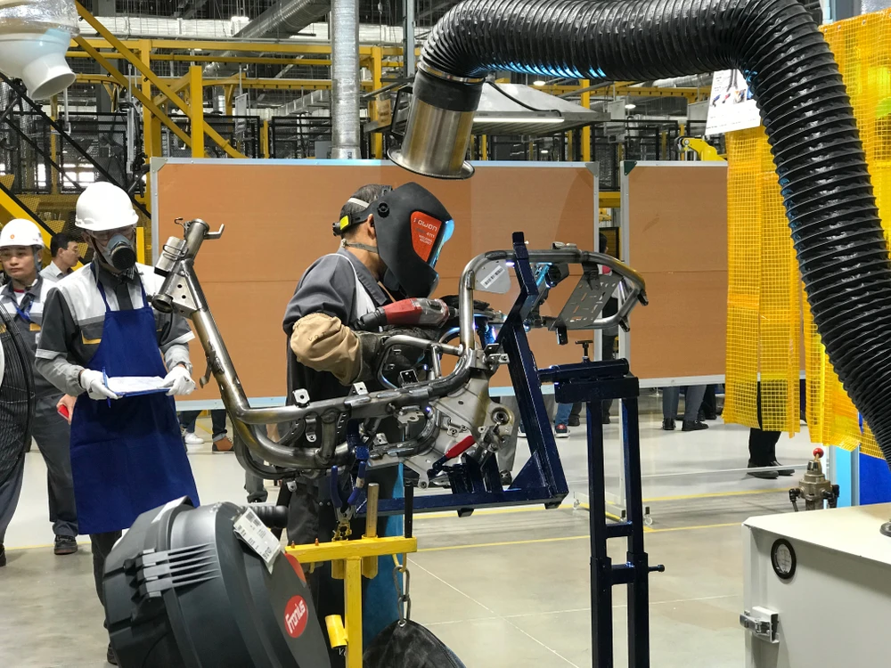 Hàn khung xe máy điện tại Nhà máy sản xuất xe điện VinFast.