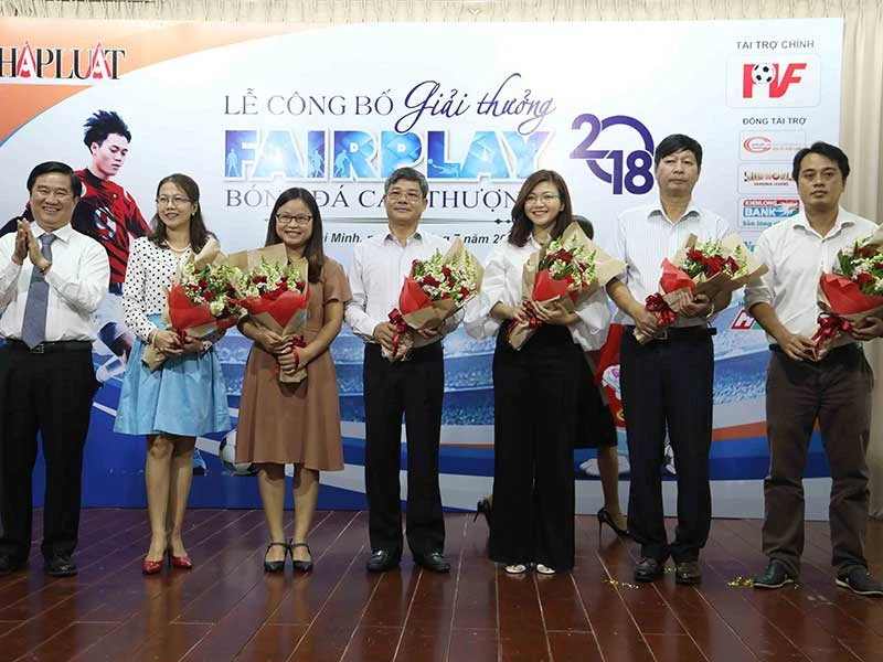Ông Lê Khắc Hiệp (thứ hai từ phải qua) cùng các nhà tài trợ trong buổi lễ công bố giải Fair Play 2018. Ảnh: HOÀNG GIANG