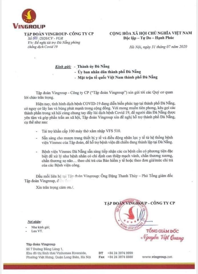 Văn bản Vingroup đề nghị tài trợ Đà Nẵng phòng chống dịch COVID-19