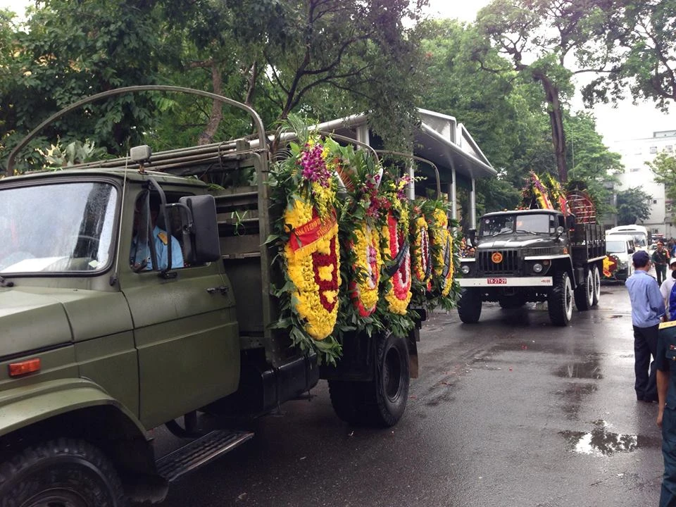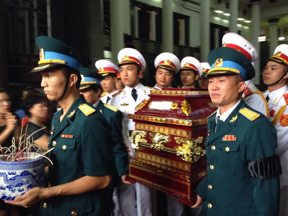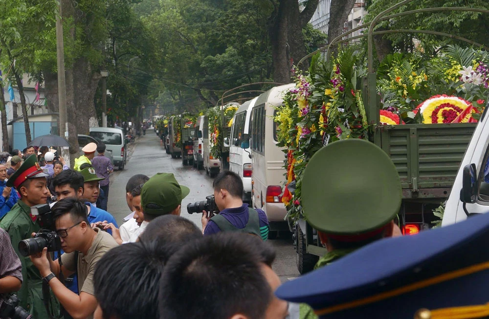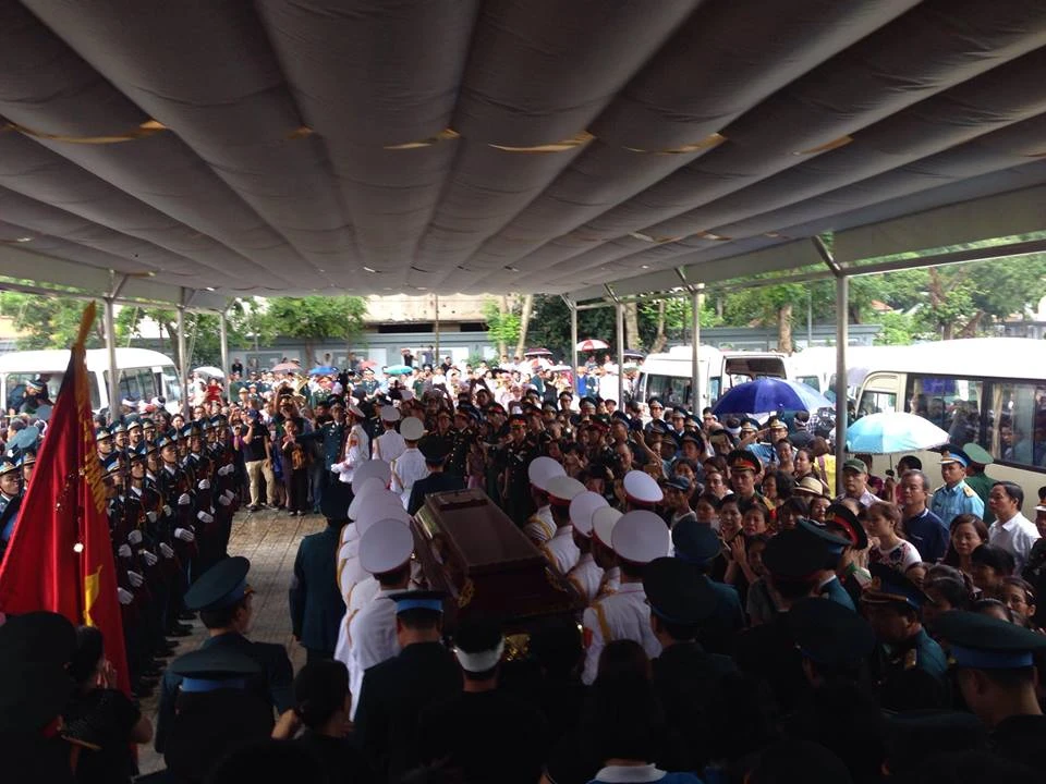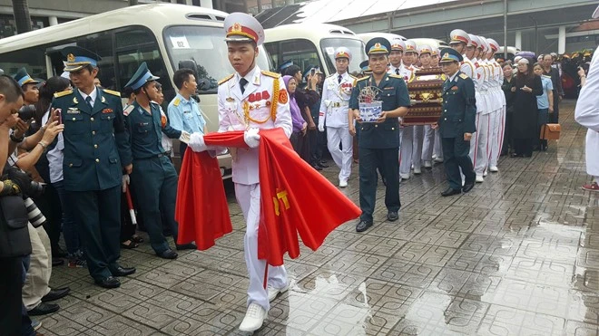 Bên ngoài, trời đổ mưa to hơn. Hai hàng tiêu binh chỉnh tề, người dân đứng chật kín nơi linh cữu sắp đi qua, chắp tay vái vọng. Nơi các anh đi qua, đồng đội giơ tay chào, mắt đỏ hoe. Phía sau, người thân lưu luyến níu giữ, nước mưa hòa nước mắt (Theo VNE)